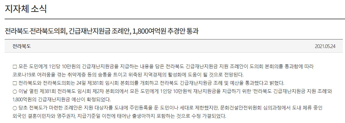 작년부터 코로나로 인해 재난지원금이 지급되고 있는데요. 중앙정부에서 전국민을 대상으로 지원하는것도 있지만 지자체에서 지급하는 재난지원금도 있다는 사실 알고계셨나요? 최근에는 전라북도 재난지원금 지급소식이 들려오고있는데요! 바로 2일전인 5월 24일에 전북 재난지원금이 최종 승인됐습니다.
