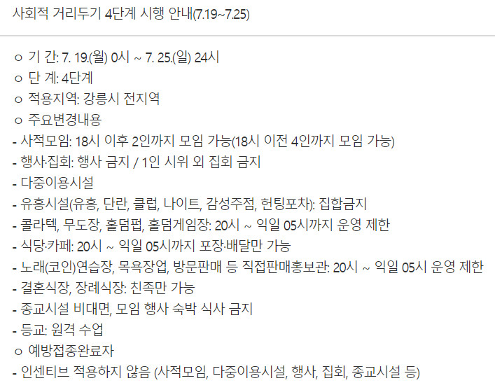 강릉 4단계 거리두기 지침(7/19 ~ 7/25)