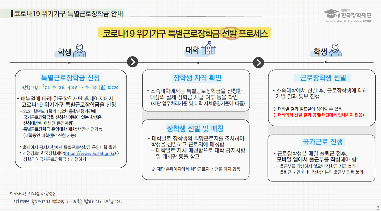 교육부와 한국장학재단은 코로나19 추경의 일환으로 경제적으로 어려워진 대학생 1만명을 대상으로 250억 원 규모의 '코로나19 위기가구 특별근로장학금'을 지원하기로 했습니다.