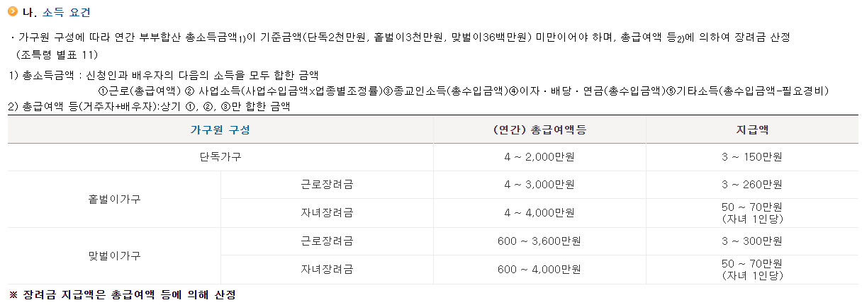 홀벌이가구 즉 외벌이가구는 3000만원 이하, 맞벌이가구는 3600만원 이하의 소득이신분들만 근로장려금을 받을 수 있답니다.