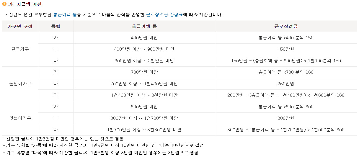 이렇게 모든 조건을 만족하시면 맞벌이 가구를 기준으로 근로장려금을 최대 300만원까지 받을 수 있답니다.