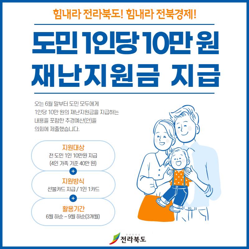아마 많은 분들이 이미 전북 재난지원금 금액이 얼마인지 들으셨을것 같기는한데요! 1인당 10만원씩 전북 재난지원금이 지급될 예정입니다. 전주 재난지원금, 익산 재난지원금, 군산 재난지원금 모두 1인당 10만원입니다. 4인 가구 기준 40만원인데요. 1명당 10만원 선불카드를 1개씩 지급한다고 합니다.