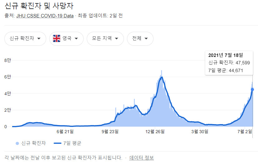 영국 역시 델타 변이가 급속도로 확산되며 코로나 신규확진자 수가 증가하고 있는 추세입니다.