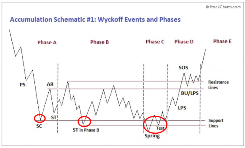 또한 가상화폐 및 비트코인 지지자들은 현재 시즌이 종료된 것이 아니며 기관투자자들이 싼 가격에 코인을 매수하기 위해 일부러 가격을 하락시킨 후 매집중이라고 주장하고 있는데요. 그 근거 중 하나가 비트코인이 와이코프(wyckoff) 차트를 따르고 있다는 점입니다. 와이코프 차트는 실제로 세력이나 기관이 매집을 할 때 나타나는 차트 패턴인데요. 꽤나 유사한 모습을 보여주고 있기는 합니다.