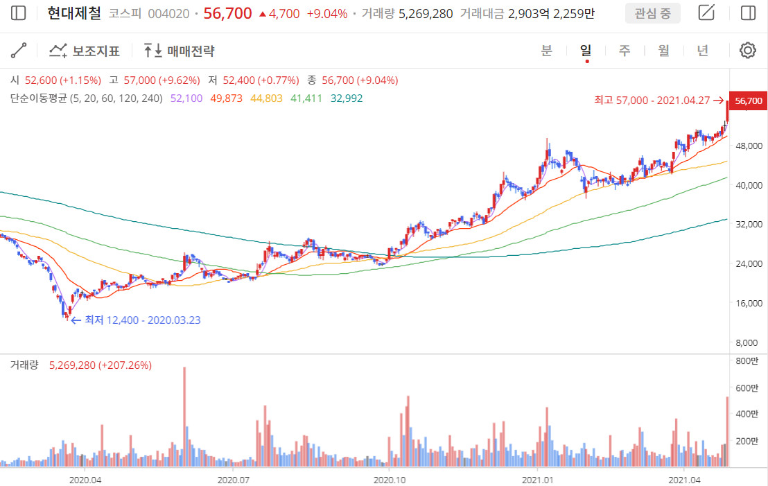 그런데 요즘 세계적으로 친환경 정책이 펼쳐지면서 철강제품의 원재료인 철광석 수급은 부족한 상황입니다. 즉, 공급이 수요를 따라가지 못하고 있는 상황입니다. 참고로 내수시장은 5월, 수출시장은 6월분까지 계약이 거의 완료됐습니다. 또한 원재료 가격 상승이 철강제품 가격에 빠르게 전이되면서 철강 제품의 가격도 지속적인 상승이 나오면서 기업들의 실적이 좋아지고 있습니다.