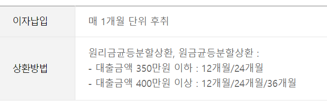 350만원 이하의 대출을 받으실 경우 대출기간은 12개월/24개월 중 선택하실 수 있습니다.
