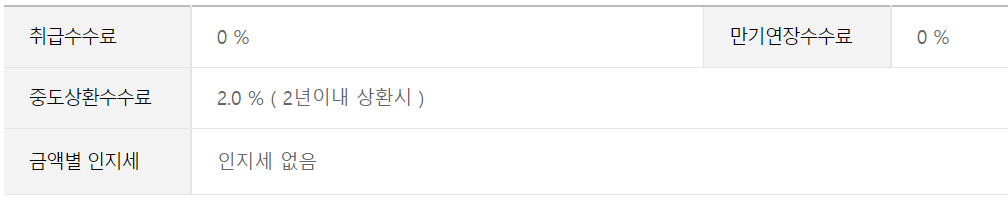 중도상환수수료는 2%입니다. 이는 1년 이내 상환시에만 적용되며, 1년 이후에는 약정기간이 끝나기 전에 남은 금액을 모두 한번에 상환하더라도 수수료가 부과되지 않습니다. 따라서 1년이 지난 후에는 여유자금이 생기셨다면 바로 갚아버리는게 이자를 줄이는데 도움이 되겠죠?